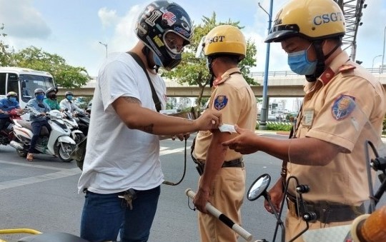 Cảnh sát giao thông kiểm tra giấy tờ của người điều khiển phương tiện giao thông