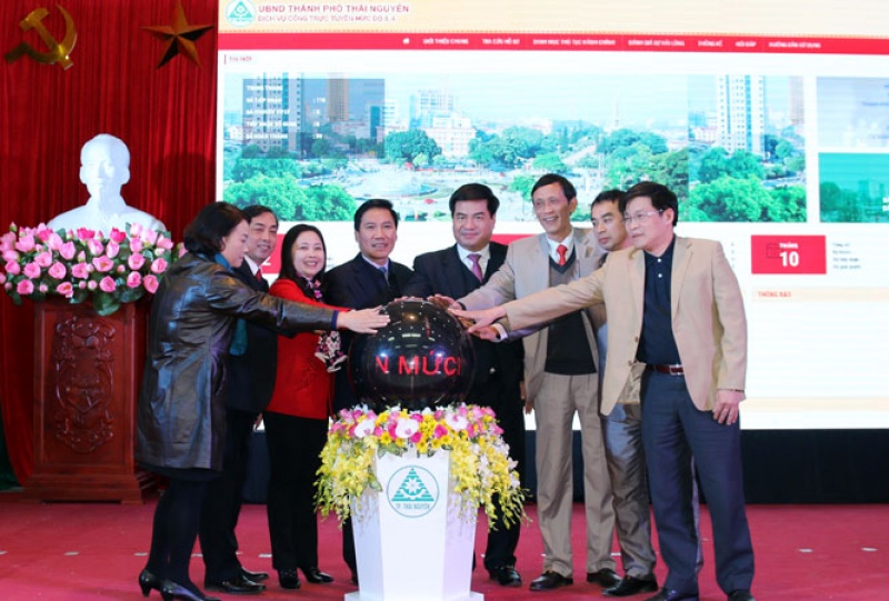 Các đồng chí lãnh đạo tỉnh và thành phố Thái Nguyên ấn nút khai trương Cổng dịch vụ công trực tuyến mức độ 3,4