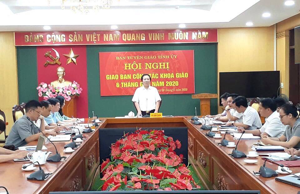 Ngày 30/6, Ban Tuyên giáo Tỉnh ủy tổ chức Hội nghị giao ban công tác khoa giáo 6 tháng đầu năm; triển khai nhiệm vụ trọng tâm công tác khoa giáo 6 tháng cuối năm 2020. Dự Hội nghị có lãnh đạo Văn phòng UBND tỉnh, các ngành trong khối khoa giáo; đại biểu ban tuyên giáo, tuyên huấn các đảng bộ trực thuộc Tỉnh ủy, Ủy ban Mặt trận Tổ quốc và các đoàn thể chính trị - xã hội cấp tỉnh và một số đơn vị, các hội cấp tỉnh. Đồng chí Lê Văn Tuấn, Ủy viên Ban Thường vụ, Trưởng ban Tuyên giáo Tỉnh ủy chủ trì Hội nghị.