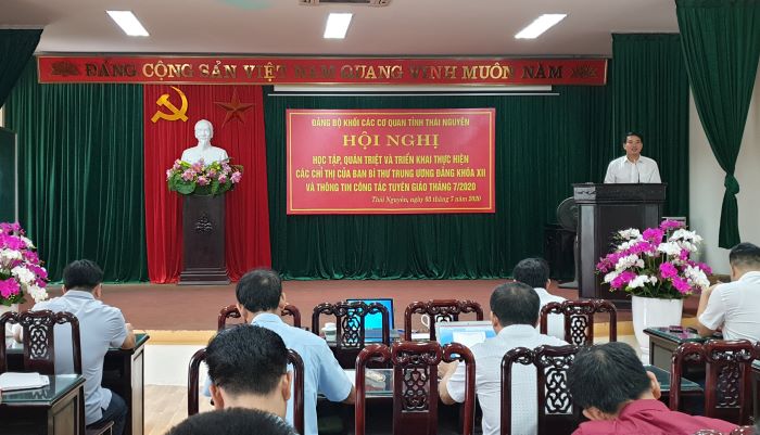 Ngày 03/7, Đảng ủy Khối các cơ quan tỉnh Thái Nguyên đã tổ chức Hội nghị học tập, quán triệt và triển khai thực hiện các Chỉ thị của Ban Bí thư Trung ương Đảng khóa XII và thông tin công tác tuyên giáo tháng 7/2020. Dự Hội nghị có các đồng chí Ủy viên Ban Chấp hành, Ủy viên UBKT Đảng ủy Khối; các đồng chí bí thư, phó bí thư các chi, đảng bộ trực thuộc; lãnh đạo, chuyên viên các Ban cơ quan Đảng ủy Khối; các đồng chí báo cáo viên Đảng bộ Khối các cơ quan tỉnh.